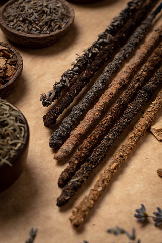 Jedes Räucherstäbchen ist mit speziellen Kräutern, Harzen und Ölen hergestellt, die auf die "Frequenzen" des jeweiligen Chakras abgestimmt sind. So wird z.B. Lavendel für das Dritte Auge Chakra verwendet, um Intuition und Klarheit zu fördern, während z.B. Sandelholz für das Kronenchakra die spirituelle Verbundenheit stärken kann.