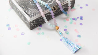 Angelite ist auch als "Engelsstein" bekannt. In dieser Mala kommt er sowohl in himmelblau als auch in zartgrün zum Einsatz. Dieser Stein soll beruhigend & stimmungsaufhellend wirken.