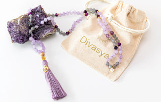 Entdecke unsere im Berliner Divasya Atelier handgefertigte echte Mala (Meditationskette / buddhistische Gebetskette), besetzt mit hochwertigen Amethysten, Mondsteinen und Achaten. Ideal für Deine Meditation und Yoga-Praxis.