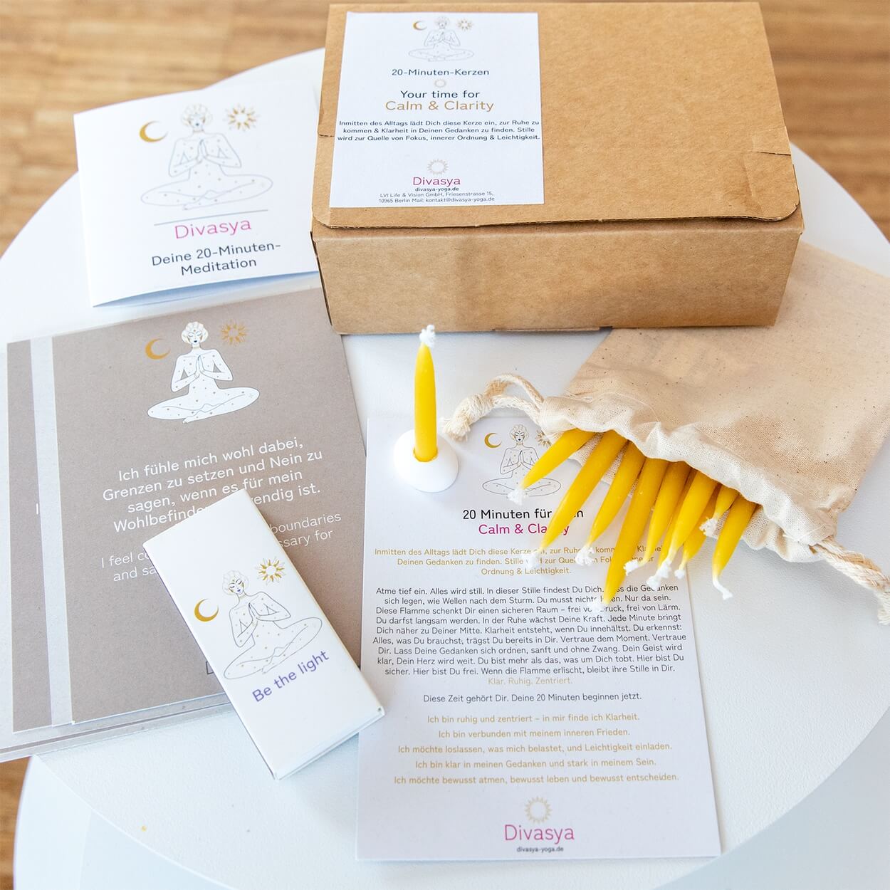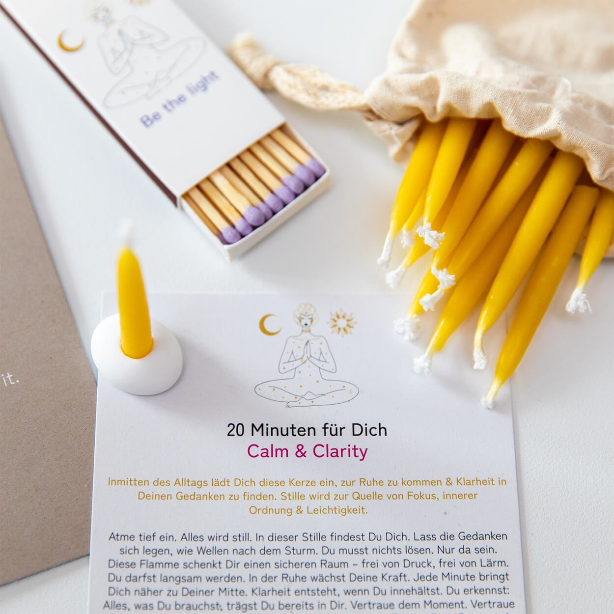 Gönne Dir bewusste Auszeiten im Alltag – ganz ohne Handy, Uhr oder Wecker. Das „20 Minuten für Dich!“ Set ist Dein liebevoll gestaltetes Ritual für innere Ruhe, Fokus und Selbstfürsorge. Jede Bienenwachskerze brennt 20 Minuten – Deine Einladung, den Moment zu genießen, loszulassen und bei Dir anzukommen.