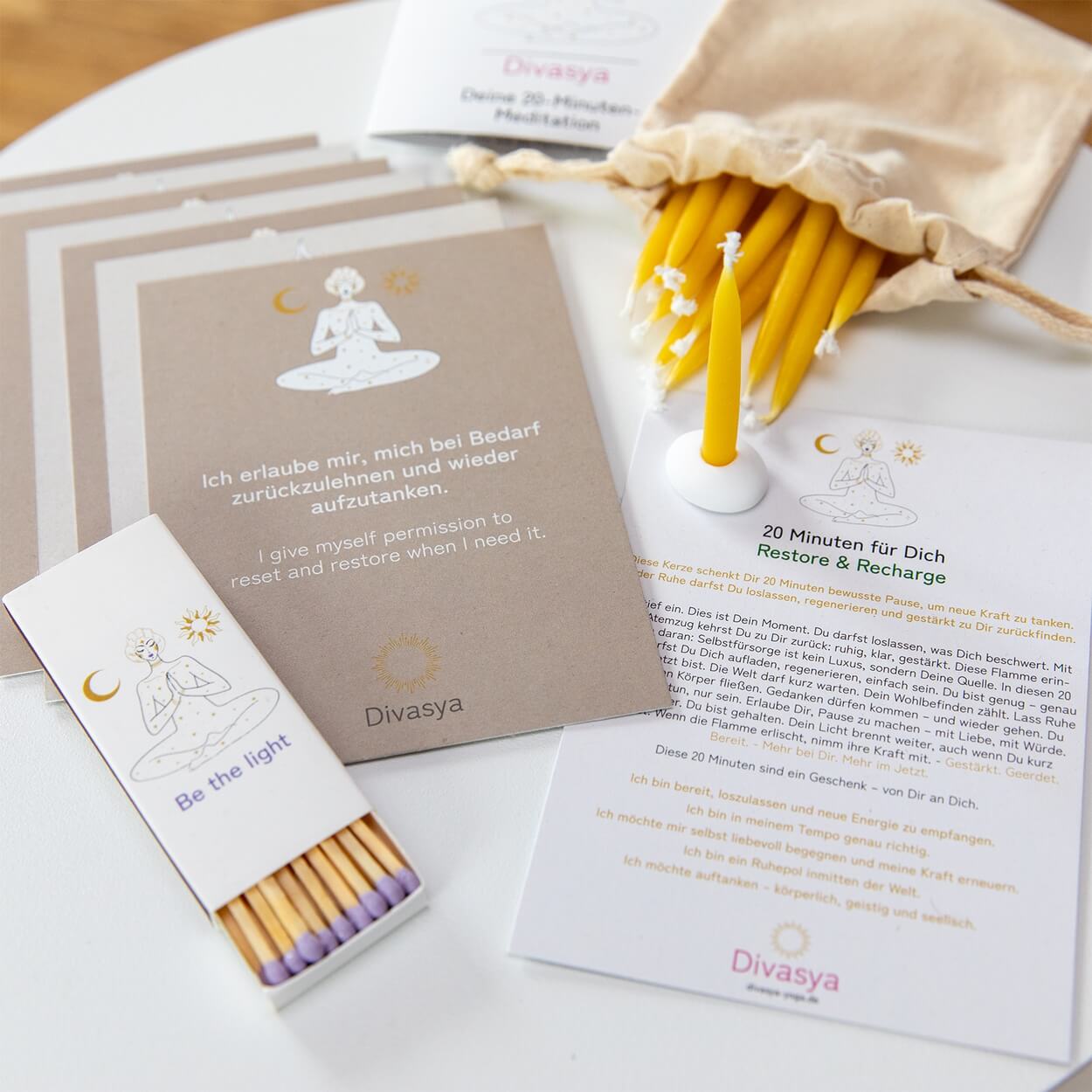 Deine 20 Minuten für Dich: Zünde die Kerze an. Lege die Themenkarte vor Dich. Wähle eine Affirmation. Atme. Spüre, wie Ruhe, Raum oder Kraft in Dein Leben zurückkehren.