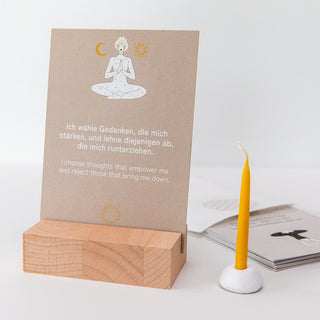 - Besonderer & größerer Kartenhalter mit Glas-Vase und Teelicht: Vereint Funktionalität und Eleganz für ein ruhiges Ambiente; aus massivem Buchenholz (FSC-zertifiziert), ideal für Deine Affirmationskarten.
