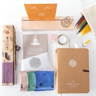 - Der Tee hilft Dir, vor oder nach der Meditation bewusst eine Pause einzulegen, während das Bullet Journal im Premium-Set Deine Reflexion unterstützt.