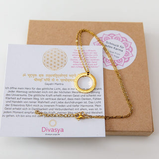 Trage die Weisheit des Lichts nah bei Dir – mit unserer feinen vergoldeten Kette mit ringförmigem Anhänger aus hochwertigem Edelstahl. Diese elegante spirituelle Kette vereint minimalistisches Design mit tiefer Bedeutung. Der runde Anhänger mit einem Durchmesser von 2,2 cm ist mit dem kraftvollen Gayatri Mantra in Sanskrit fein graviert – ein uraltes Gebet für Klarheit, Schutz und spirituelle Erleuchtung.