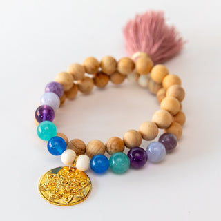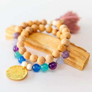 Das Mala Armband Sandalwood Bliss vereint natürliche Materialien, spirituelle Symbolik und solide Handarbeit. Mit 30 Sandelholz-Perlen (8 mm), ergänzt durch 10 echte Edelsteine (jeweils 2 Perlen aus Turmalin, Aquamarin, Amethyst, Amazonit und blauem Achat), strahlt dieses Wickelarmband Harmonie und Balance aus. Die zarte roséfarbene Quaste und der vergoldete Lotus-Anhänger machen das Mala Armband zu einem stilvollen Accessoire, das gleichzeitig als spiritueller Begleiter dient.