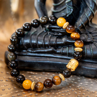 Dieses Armband aus wertvollen, 8mm großen Kristallen ist aus Obsidian, Tigerauge und Mookait gefertigt. Die auffällige Buddha-Schmuckperle, sowie weitere goldene Details, sind mit 18k vergoldet.