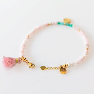 Dieses Yoga Armband strahlt nicht nur Eleganz, sondern auch Beständigkeit aus. Feine vergoldete Zwischenperlen und eine zarte, leicht pinke Mini-Quaste verleihen dem Armband eine harmonische und ausgewogene Optik.