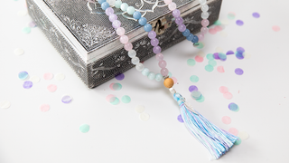 L'angélite est également connue sous le nom de « pierre d'ange ». Dans ce mala, il est utilisé à la fois en bleu ciel et en vert délicat. On dit que cette pierre a un effet calmant et améliorant l’humeur. Il est souvent utilisé en cas de stress psychologique extrême.