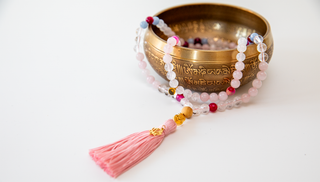 Un grand soin est apporté à la finition de votre mala pour compléter le thème du collier mala : un cœur plaqué or 18 carats fait office de perle décorative et un pendentif fleur de lotus plaqué or qui décore le pompon soyeux fait main.