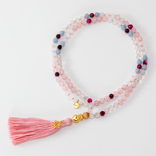 - 108 perles composées de pierres précieuses ou de cristaux (quartz rose, pierre de lune, angélite, etc.)