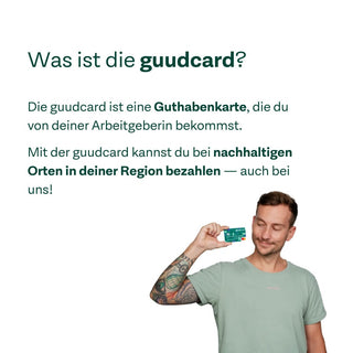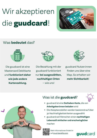 - Die guudcard ist sowohl als physische Karte als auch in virtueller Form verfügbar. Sie fördert nachhaltigen Konsum und stärkt lokale, umweltbewusste Unternehmen.
