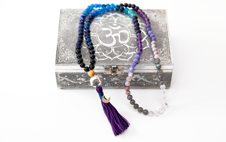 - 108 kralen gemaakt van echte edelstenen of kristallen: Amethist, Maansteen & Lapis Lazuli